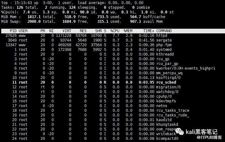 首先查找可以进程,查找当前服务器中,是那个进程占用了大量的服务器资源。我们只需用系统自带的命令top即可。如下: