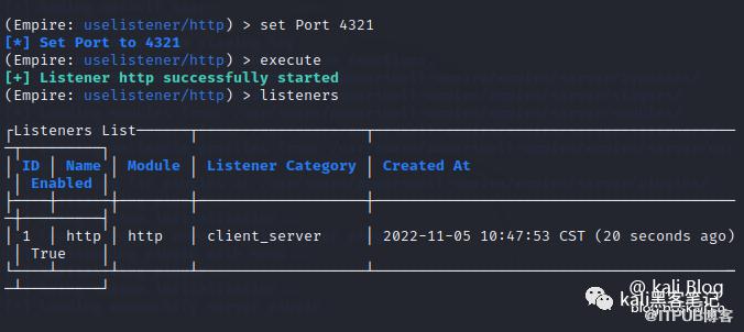Empire的使用方法与msf的方法相同,先设置监听,生成木马,然后监听反弹代理。输入Listeners进入监听页面,uselistener设置监听模式,共有7种模式