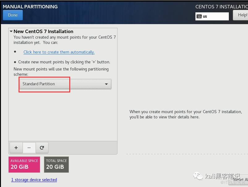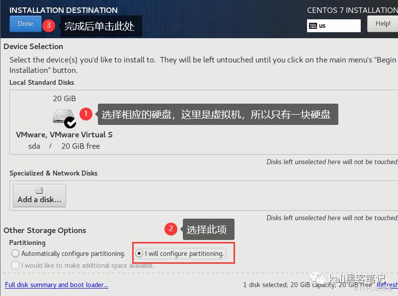 先选中相应的硬盘,选择I will configure partitioning 自定义分区,完成后单击Done