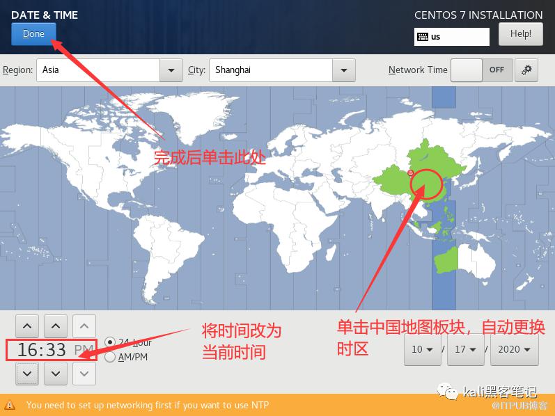 切换时区为Asia - Shanghai,将时间改为当前时间,完成后单击Done或下一步