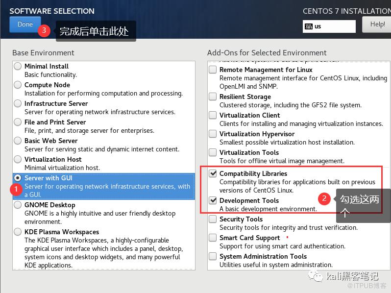 选择Server with GUI,在右边勾上Compatibility Libraries 和 Development Tools,完成后单击Done