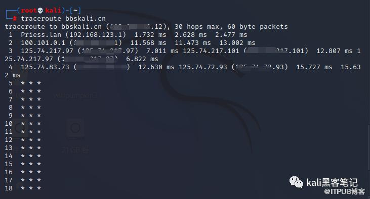 可以看到,我到bbskali.cn的跟踪路由需要 4 次跳跃才能到达。您会注意到跃点 6 上有一些星号,这意味着特定设备阻止了我们的跟踪路由。
