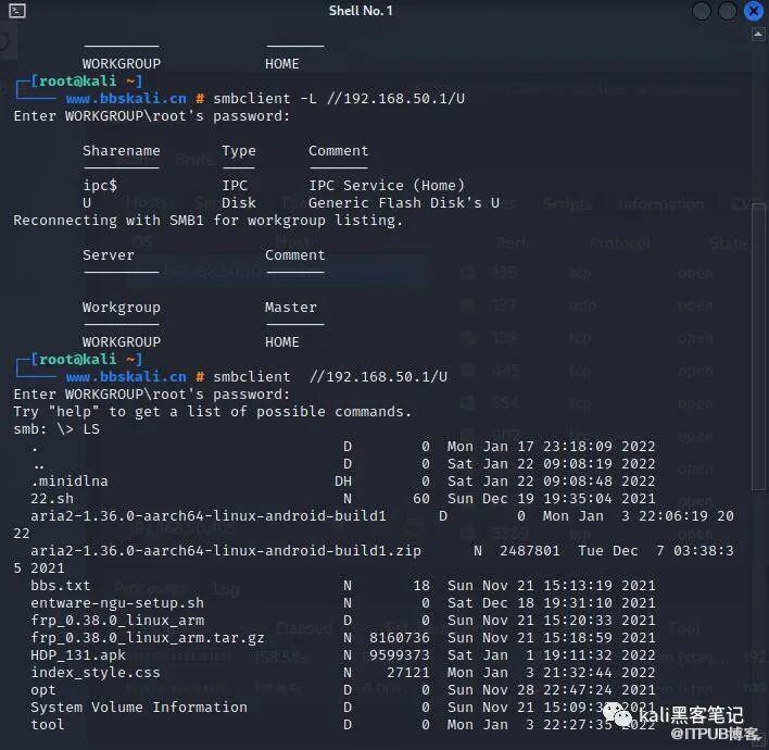 #列出共享的文件smbclient -L //192.168.1.25#进入文件smbclient //192.168.50.1/U#将共享的文件夹挂载到本地的一个目录上mount -t cifs //192.168.50.1 /Users/mnt