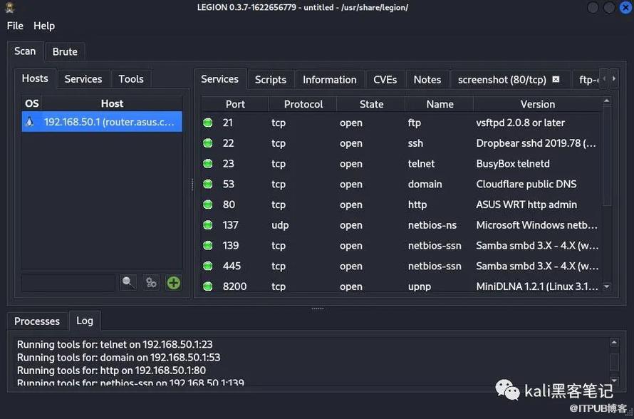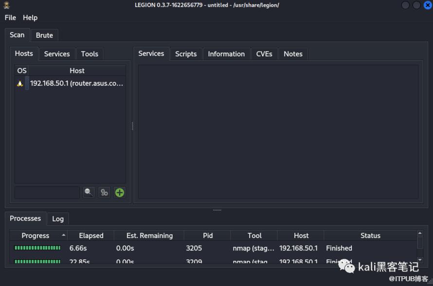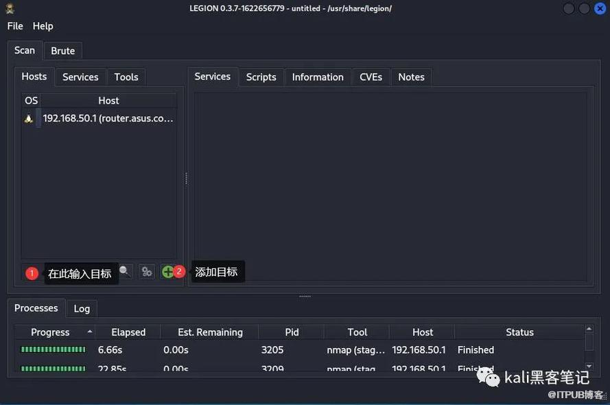 Legion集成了nmap的端口扫描和常见端口的破解功能。并且支持图形化操作,简化了复杂的命令行操作。是对于刚入手kali小白的必选神器,同时它可以在扫描过程中直接发现目标存在的CVE漏洞,在配合神器msf完成后期的渗透测试。