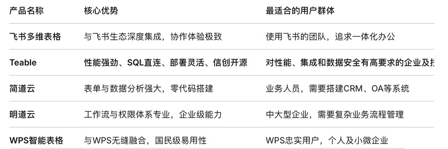 下面,我们就来深入解析五款在国内市场备受关注的 多维表格产品:飞书多维表格、Teable、简道云、明道云和WPS智能表格。