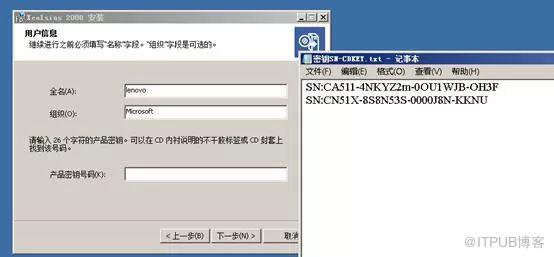 7、弹出“用户信息”界面,这一步需要输入产品密钥号码,如下图所示,输入右侧TXT文件中的密钥,上下任意一个密钥均可。输入密钥之后,然后点击“下一步”即可。