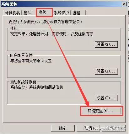 7、之后弹出“系统属性”界面,选择“高级”选项卡,再点击右下方的“环境变量”,如下图所示。