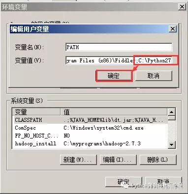 9、之后在弹出的“编辑用户变量”的“变量值”最后将刚刚复制的路径进行粘贴(快捷键是Ctrl+V)。特别需要注意的是在路径之前要添加一个分号,该分号是英文状态下的分号,表示与前边的路径分开,是另外一个路径。说白了,就在在变量值下输入“;C:\Python27”或者“;你的Python安装路径”即可。完成之后,一路点击确定即可。