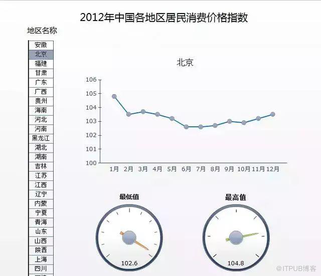 下面这张图是小编利用水晶易表做的2012年中国各地区居民消费价格指数模型,在水晶易表中可以进行互动的,只要点击不同的省位,便可以查看其每个月份的消费价格,在仪表盘中可以查看最高值和最低值~~有没有觉得很高大上呢?