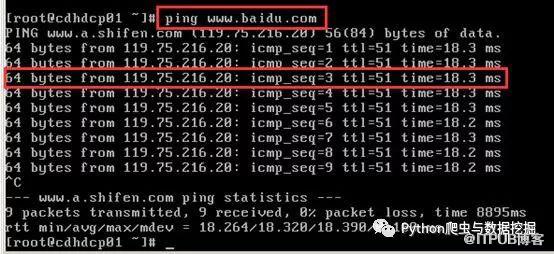 7、最后可以通过ping www.baidu.com进行网络ping通测试。如果IP可用的话,服务器会有响应的,如下图所示。如果要终止运行,使用Ctrl+C强制退出即可。