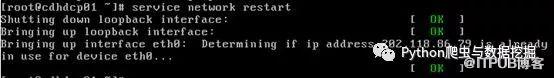 5、之后重启网络,在命令行中输入service network restart。重启网卡成功之后右边会出现绿色的ok字样,如下图所示。如果出现红色的Failed,说明网络配置出现问题了,常见的错误是IP不可用或者ONBOOT和BOOTPROTO未更改。