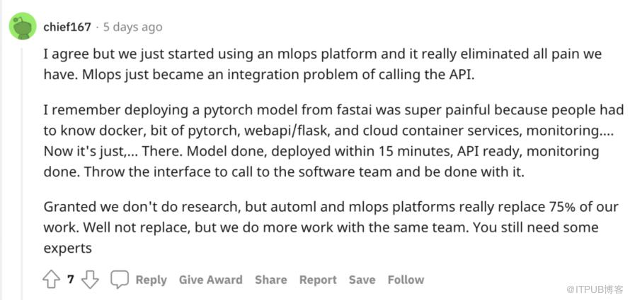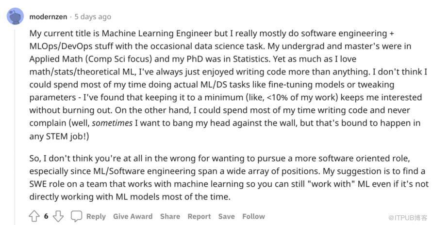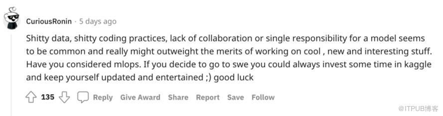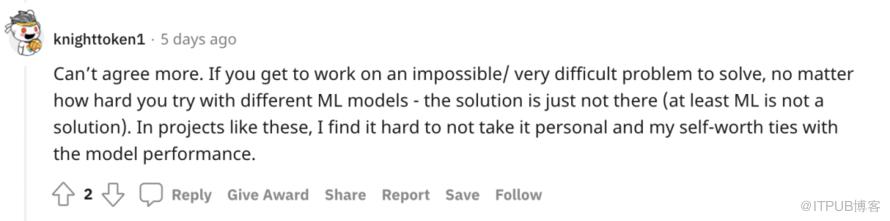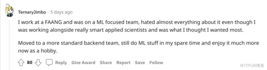 实际上,@hedy-m 的抱怨在 ML 领域很常见。“弃坑”派网友表示很有共鸣,劝他去搞软件工程。基本上,不少机器学习项目需要为获取相关资源和数据而四处奔走,你还需做耗时的数据处理工作,但最终 ML 项目的成功取决于你所拥有的数据甚至是运气。模型没有按预期工作总让人感到沮丧,并且你还要为此负全部责任。Reddit 网友 @knighttoken1 称,如果你开始解决一个不可能或者非常困难的问题,无论如何尝试使用不同的 ML 模型都不灵时(至少 ML 不是解决方案)。在这样的项目中,很难不把个人价值与模型性能联系起来。 “在 ML 工作中,你很容易工作 14 小时,同时失去友谊、社交和健康,最终仍然一无所获”:)此外,大部分 ML 工程师日常用的是知名模型或复现其他论文,创造性空间有限,难以获得成就感,有人认为,要想在机器学习工作中做出好成绩,还是要有 Phd 加持去做研究。当你成为 ML 的大牛,轻松输出各种相关论文时,生活就美满幸福,但要想有影响力和创新性,自然也会承受各种压力。即便在大厂,只有极少数地方才会用到最前沿的ML研究,况且还是业务优先。@TernaryJimbo 提到,在大厂 ML 团队带过后,现在讨厌关于 ML 的一切,他转到了更标准化的后端工作,只是把ML当成一种业余爱好。还有人提到,机器学习工程师还要努力展示与某些业务 KPI 相关的直接商业价值,而模型的改进不一定会对业务 KPI 产生直接影响,因为还有很多其他因素促成数据产品取得成功,由于涉及到如此多的不确定性,他们通常也不得不使用太花哨的东西,因此,旧招数不断被重复使用。相对而言,做软件工程不确定性更小,优秀的软件工程师投入必要的时间,就会获得积极的结果,而且对任何科技公司来说,软件工程项目都是更成熟的核心业务。 2