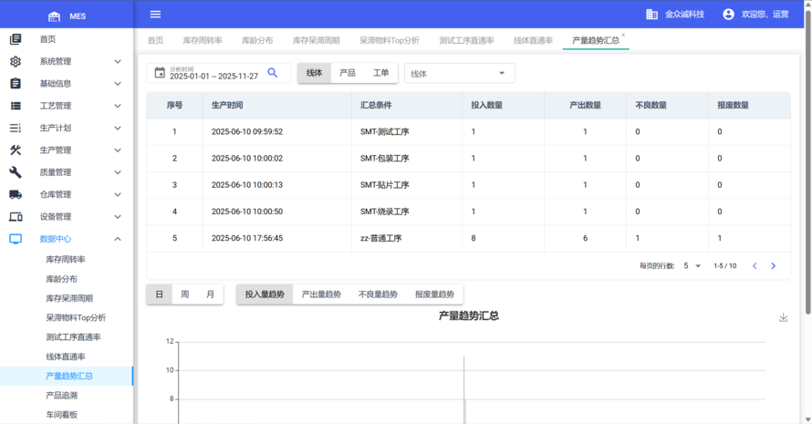 值得一提的是,像 金众诚 MES 这样的平台,正是基于这一理念设计:采用轻量架构降低部署门槛,通过模块化组合适配不同制造场景,并围绕生产计划、工单执行、质量追溯等核心环节构建闭环。其数据中心模块还能自动生成线体直通率、产量趋势、呆滞物料分析等报表,帮助管理者从 “救火式响应”转向“预测性优化”。