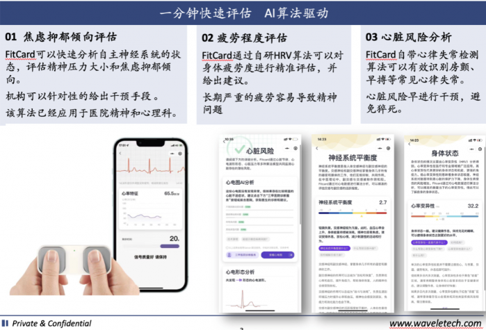 苏州唯理科技作为国内的心电图芯片算法行业领头羊企业,针对此场景推出了一款硬件+算法的解决方案,可以在一分钟完成快速评估,由AI算法驱动,可以对焦虑抑郁倾向、身体疲劳程度、心脏风险进行评估和筛查。该解决方案已经获得医疗器械注册认证,同时应用在部分医院的精神科与心理科当中。