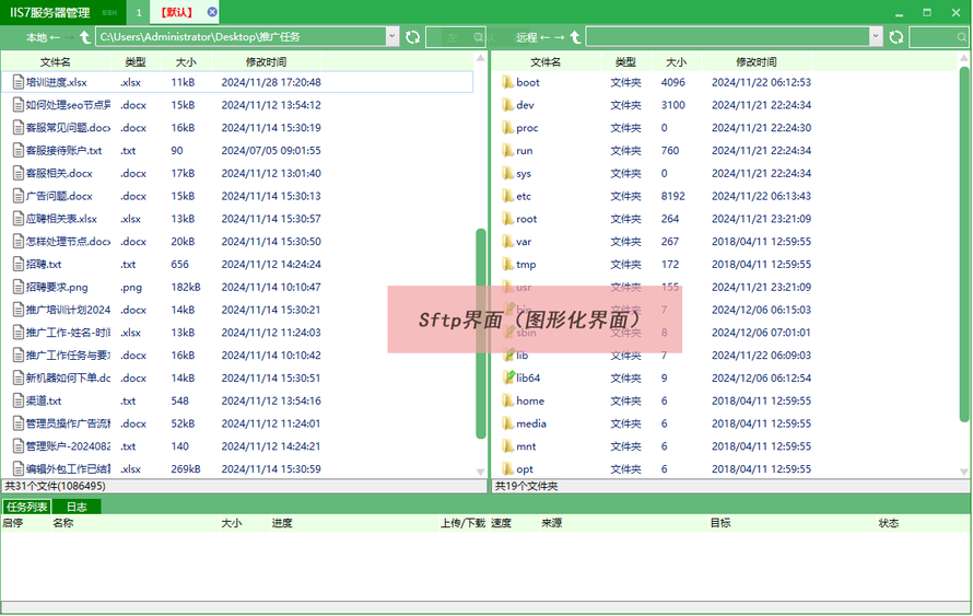 4、当涉及SFTP文件传输时,操作同样便捷高效,添加服务器信息后,会直观展现SFTP图形界面,以可视化图片形式清晰呈现文件资源,拖拽文件图标即可轻松达成上传、下载任务,传输进度一目了然,如图所示: