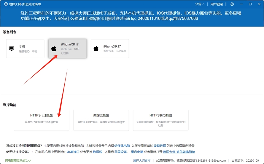 1.设备列表中选择 -> iPhone,在下方选择功能中选择 -> HTTPS代理抓包,即可进入抓包页面。