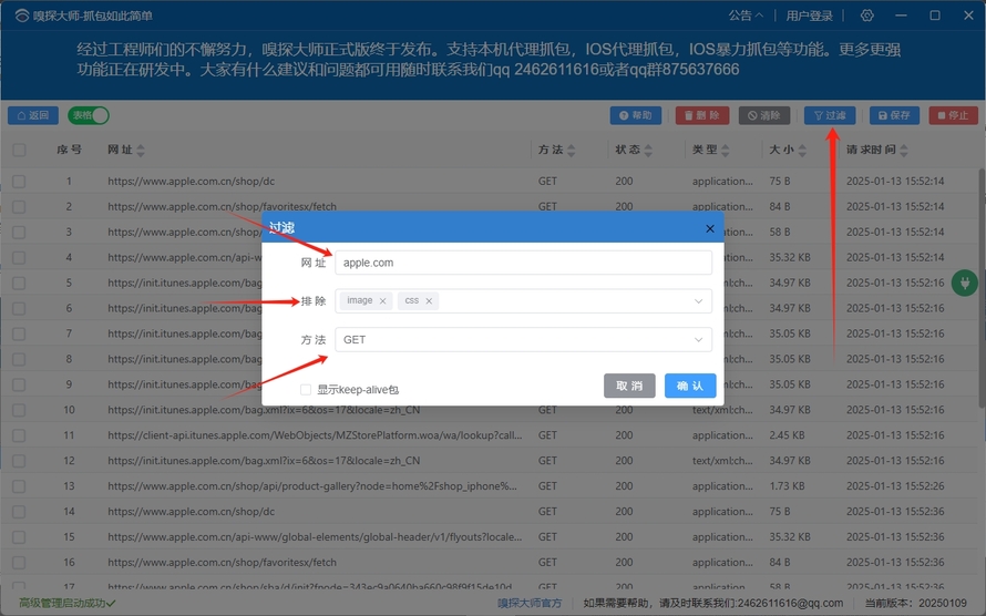 (1)点击[过滤]按钮,第一栏可以输入要接收网址的部分地址,支持部分匹配,支持正则。