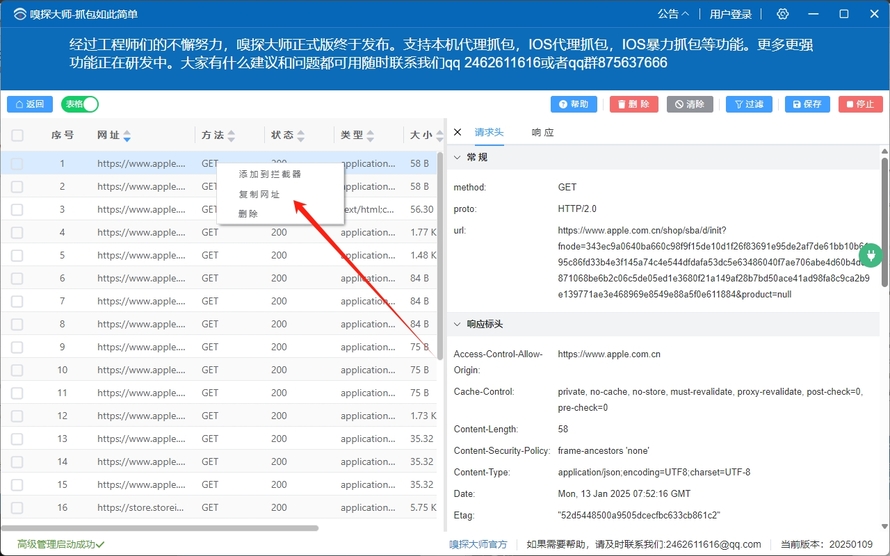 右键操作: 抓包记录支持右键操作,可以删除或复制网址,或者添加到拦截器。