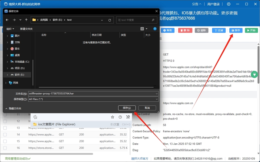 保存: 将抓取到的数据保存为 HAR 格式,供其他软件使用或下次继续分析。