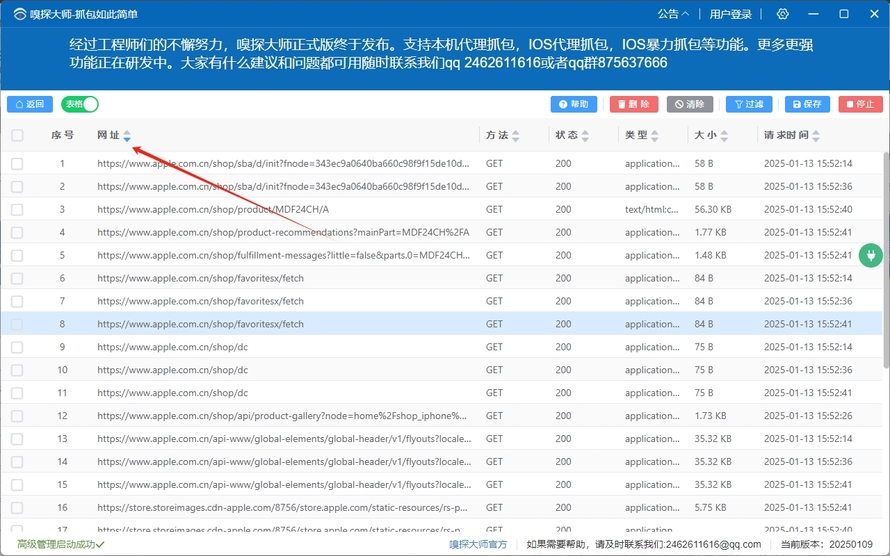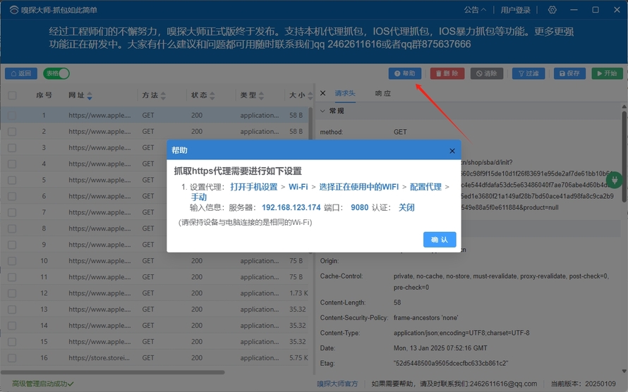(1)点击右上角[开始],自动开启代理,即可开启全局抓包,任何网络数据都会在此显示。