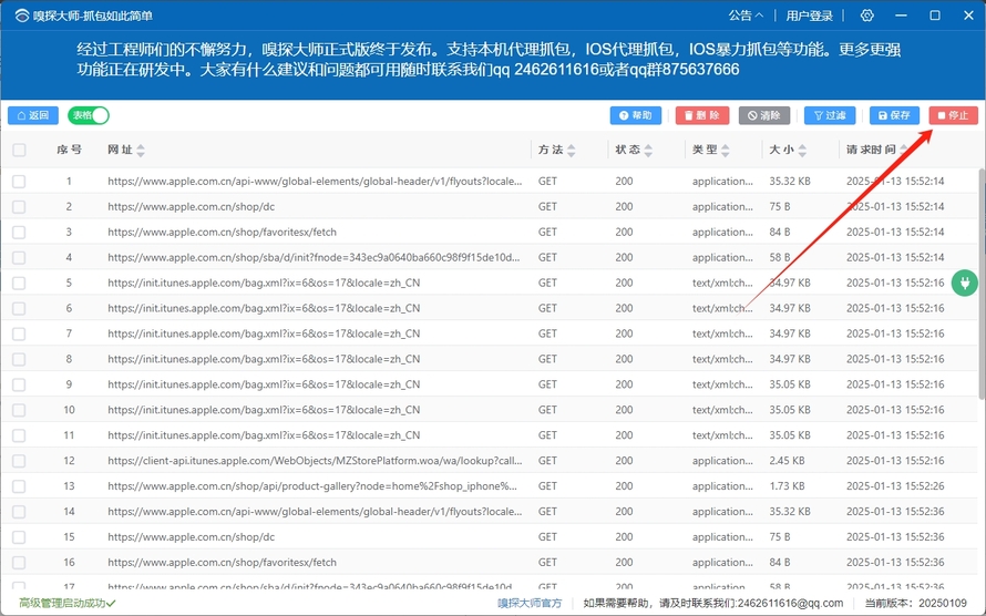 (2)点击[停止],关闭代理,停止抓包。