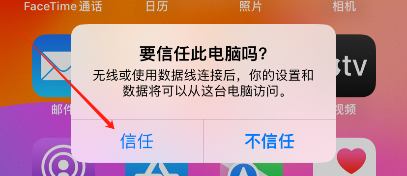 1.使用数据线连接手机,手机上点击信任,输入密码
