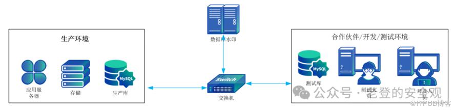 数据库水印系统一般部署在生产环境和合作伙伴/开发/测试环境中间,保证前后网络可达。生产库中的原始数据,经过数据库水印系统添加水印后,分发给操作人员,整个过程数据保持不落地(也就是,不留在数据库水印系统存储中,一般是内存直接操作了,过段时间就释放了)。