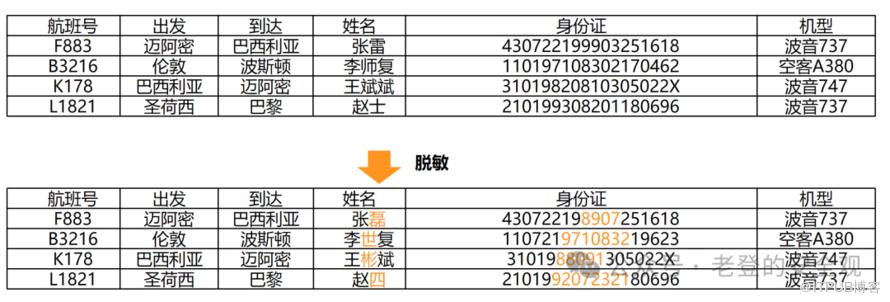 就是系统会自动识别数据源中有效列的数据类型、格式,随机抽取水印位置,对数据进行脱敏,更改后的数据与原数据类型、格式保持一致。