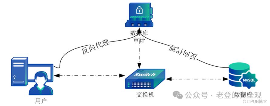 反向代理适用于流量不能到数据库审计设备,又不允许安装插件(Agent、探针)软件的情况。它的原理是直接把数据库审计设备当作一个代理,应用客户端数据库连接,直连到数据库审计设备,通过数据库审计再到数据库,从而达到数据库审计--->数据库的目的,唯一变化的也就是连接登录的方式变了。