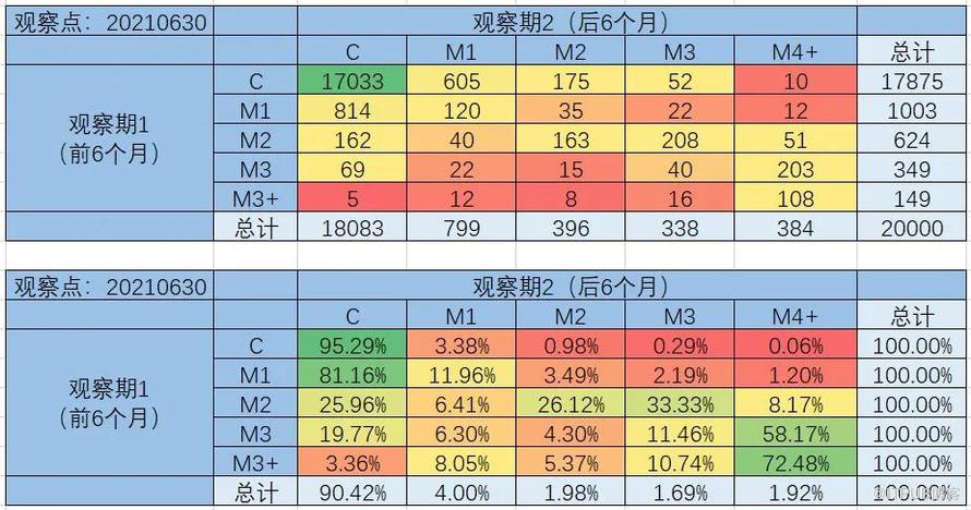 例如,选择观察点为2021年6月30日晚上12点,取20,000个客户作为观察对象,统计这些客户从观察期1到观察期2的最大逾期状态变化情况。