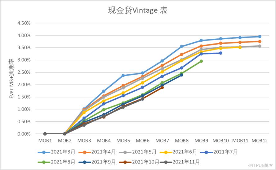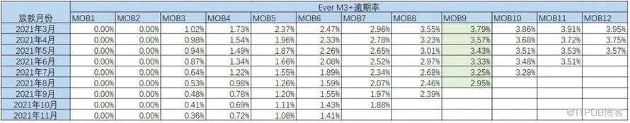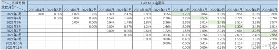 ④数据统计的是Ever M3+逾期率,所以账龄MOB1、MOB2的都为0。
