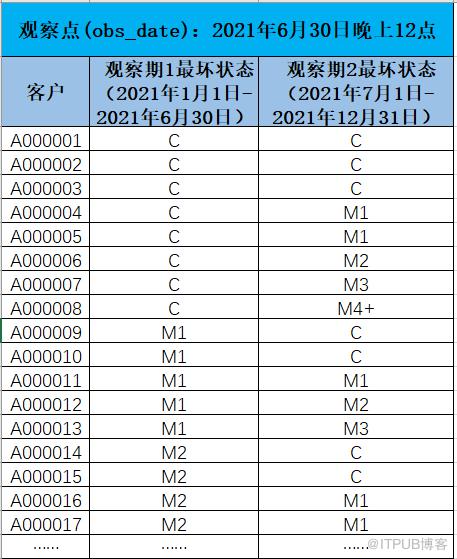 step1:选择观察点1,以观察点1为截止时间,根据还款计划表统计客户在观察期1(如过去6个月)的最长逾期期数,按最坏逾期状态将客户分为不同层次,如C、M1、M2、M3、M4+等。