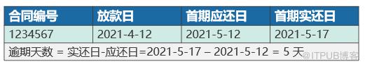 即客户在第一个还款日(2021年5月12日)未还款,那么2021年5月13日即为逾期一天,客户在5月17日还款,该客户首逾5天。
