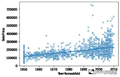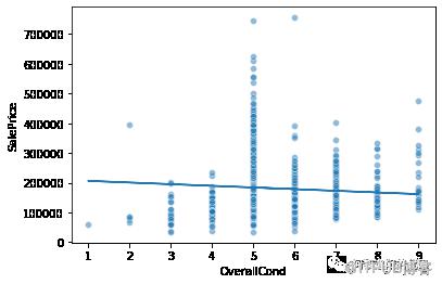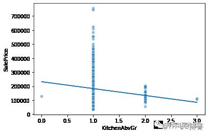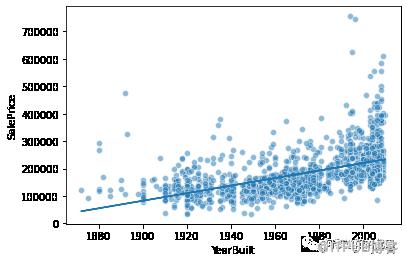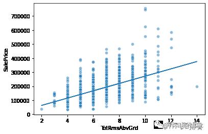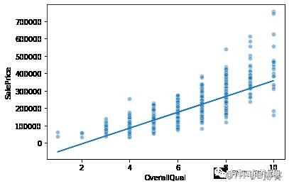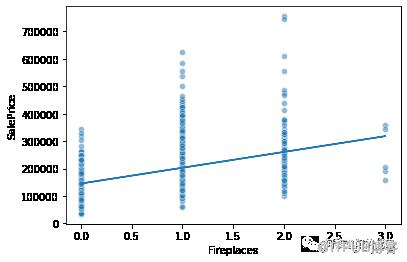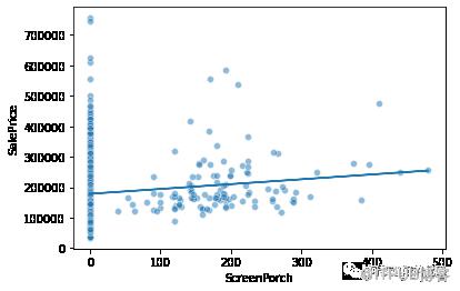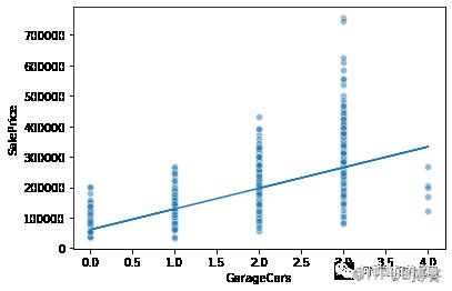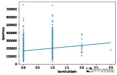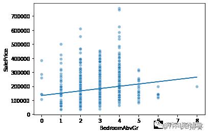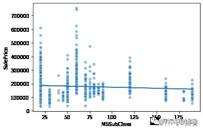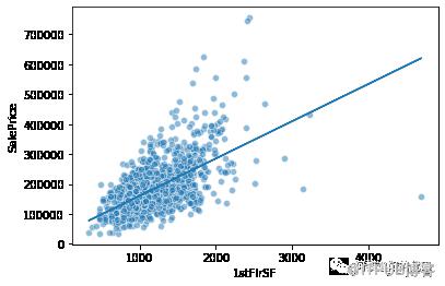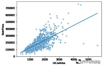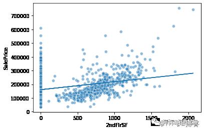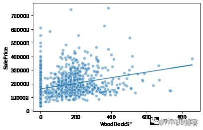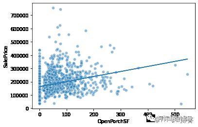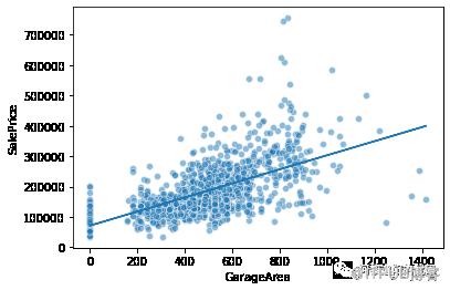 #读取特征中文标签x_label = pd.read_csv('x_label.csv', encoding='gbk')x_label.head(2)for i in num_features:#打印特征中英文名称print('特征:', i, '(', x_label[x_label['英文名'] == i]['对应中文'].values[0], ')')#画散点图sns.scatterplot(x=i, y='SalePrice', data=train_date, alpha=0.5)#尝试画拟合线try:z = np.polyfit(train_date[i], train_date['SalePrice'], 1)p = np.poly1d(z)plt.plot(train_date[i], p(train_date[i]))except:passplt.show()print('==================================================')print('')