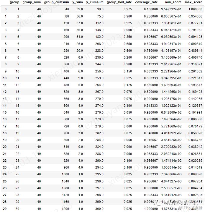 def count_table(predict, y, num=100):'''predict为预测值y为真实值num为分组的数量'''num=numcheck_table=pd.concat([predict, y], axis=1)check_table_1=check_table.sort_values(by="predict",ascending=False).reset_index(drop=True)check_table_1['rank']=np.floor((check_table_1.index / len(check_table_1) * num) + 1)check_table_1=check_table_1.astype(float)group=pd.DataFrame(check_table_1['rank'].drop_duplicates().reset_index(drop=True))group=group.astype(int)group_num=pd.DataFrame(check_table_1['rank'].value_counts().reset_index(drop=True))count_table=pd.concat([group,group_num], axis=1)count_table.columns=['group', 'group_num']count_table['group_cumsum']=count_table['group_num'].cumsum()count_table['y_sum']=pd.DataFrame(check_table_1.groupby(by=['rank'])['y'].sum().reset_index(drop=True))count_table['y_cumsum']=count_table['y_sum'].cumsum()count_table['group_bad_rate']=count_table['y_sum']/count_table['group_num']count_table['coverage_rate']=count_table['y_cumsum']/sum(count_table['y_sum'])count_table['min_score'] = pd.DataFrame(check_table_1.groupby(by=['rank'])['predict'].min().reset_index(drop=True))count_table['max_score'] = pd.DataFrame(check_table_1.groupby(by=['rank'])['predict'].max().reset_index(drop=True))return count_tablecount_table=count_table(train_date['predict'], train_date['y'], 30)count_table