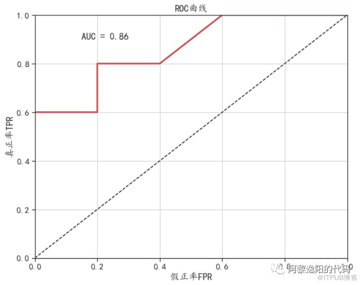 import osimport pandas as pdimport matplotlibmatplotlib.rcParams['axes.unicode_minus']=False#处理图像显示中文的问题import seaborn as snssns.set(font= "Kaiti",style="ticks",font_scale=1.4)from sklearn.metrics import *y_pred = [0.9, 0.8, 0.3, 0.7, 0.5, 0.6, 0.4, 0.3, 0.1, 0.2]#预测值y_true = [1, 1, 1, 1, 1, 0, 0, 0, 0, 0]#实际值fpr_Nb, tpr_Nb, _ = roc_curve(y_true, y_pred)aucval = auc(fpr_Nb, tpr_Nb) # 计算auc的取值plt.figure(figsize=(10,8))plt.plot([0, 1], [0, 1], 'k--')plt.plot(fpr_Nb, tpr_Nb,"r",linewidth = 3)plt.grid()plt.xlabel("假正率FPR")plt.ylabel("真正率TPR")plt.xlim(0, 1)plt.ylim(0, 1)plt.title("ROC曲线")plt.text(0.15,0.9,"AUC = "+str(round(aucval,4)))plt.show()