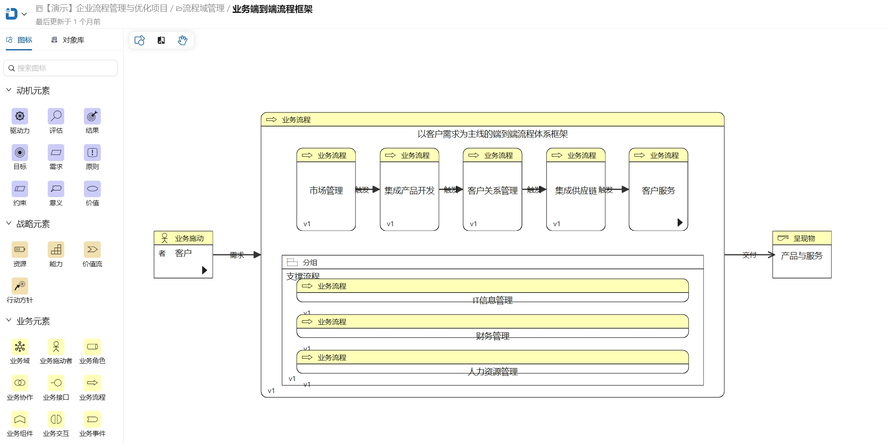 架构工具中,不仅实现对架构图、文档的编制,同时支持流程的编制,确保满足企业不同架构设计场景需求。