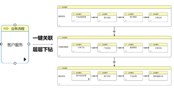 不仅实现架构间的关联, 架构工具也可同时可对企业内文档资源进行关联,如间投诉处理规范文档与投诉处理流程对象进行关联,确保文档规范随流程走。