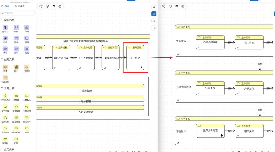 通过图形化的方式,构建客户需求为主线的端到端体系框架,形成企业整体面向客户的服务流程总体蓝图,实现从客户需求到产品交付与服务的全链条闭环,为企业客户服务整体建设提供方向。