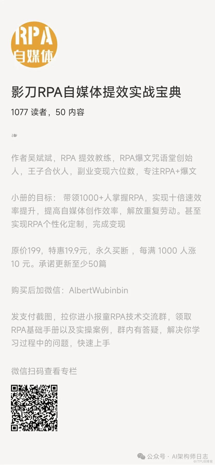 大家好,我是吴。 本公众号专注于分享RPA技术、AI技术、AI工具、AI前沿知识、AI变现等内容。感谢您的阅读,关注我一起成长进步。