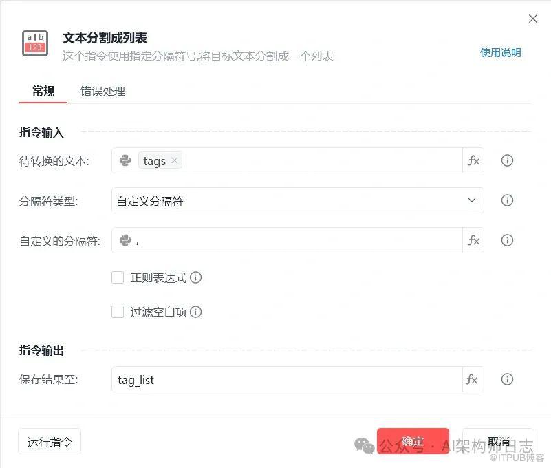 这里我们使用【文本分割成列表】,根据英文逗号切割tags字符串,也就是将“#职场,#职场转型”转为集合,这样后面就可以循环写入了
