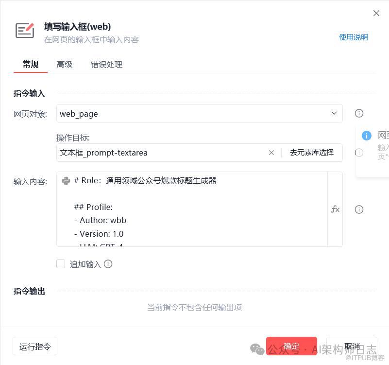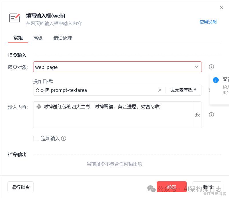这里使用获取相似元素列表(web),获取ChatGPT输出的内容列表。因为我们无法判断,从哪里开始取内容。所有我们只要取对话内容开始以后,列表的最后一个就可以了。对话一次然后取一次,对话n次取n次,对话完就取输出内容