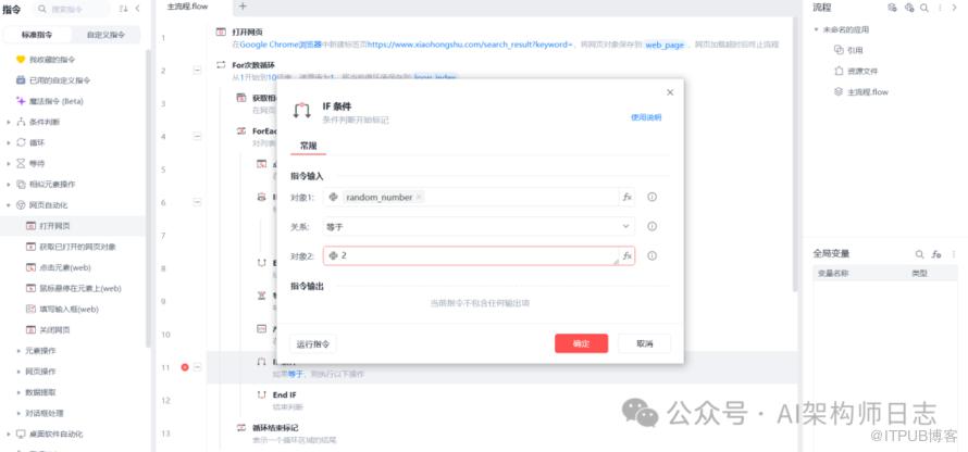 接着我们添加一个【IF 条件】,判断随机数等于2,我们就给点赞,模拟一个随机点赞的效果