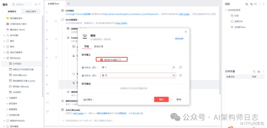 模拟人为操作,这里我们添加一个等待按钮,停留随机秒数。下图的设置就是随机1-5秒