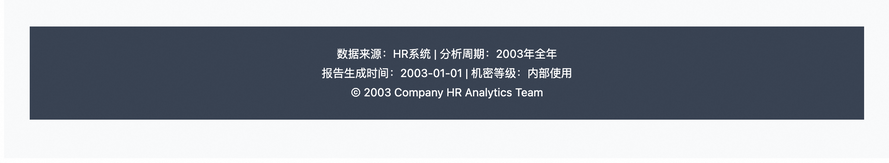 "description": "页脚信息块,深灰色背景(#374151),白色文字。居中显示三行内容:第一行\u201c数据来源:HR系统 | 分析周期:2003年全年\u201d,第二行\u201c报告生成时间 | 机密等级:内部使用\u201d,第三行\u201c© 2003 Company HR Analytics Team\u201d。使用小号字体。",