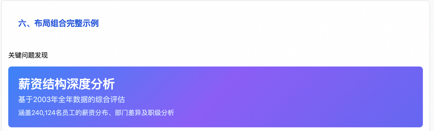 "style": "视觉效果丰富,善于运用背景色、带颜色的左侧起始条、Icon等营造视觉效果。不同类型的分析内容使用不同的卡片样式:洞察发现使用蓝色/紫色系,风险预警使用黄色/橙色系,正面结论使用绿色系,一般说明使用灰色系。字体对比关系安排妥当,标题突出、正文舒适。作为基准,正文字号采用ShadCN标准的text-sm,其他字号根据相对关系调整",
