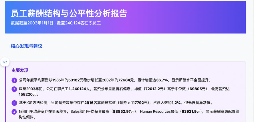 "description": "渐变色蓝紫背景的报告标题区域,用大字体突出展示\u201c员工薪酬结构与公平性分析报告\u201d(固定文本),副标题用小字体显示\u201c数据截至2003年1月1日 \u00b7 覆盖240,124名在职员工\u201d。",