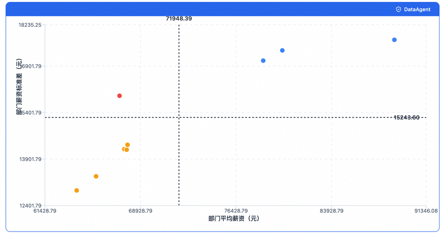 "description": "部门薪资四象限图(BI ScatterQuadrant示例),X轴为平均薪资,Y轴为薪资标准差。通过四象限分析部门薪资结构特征。",