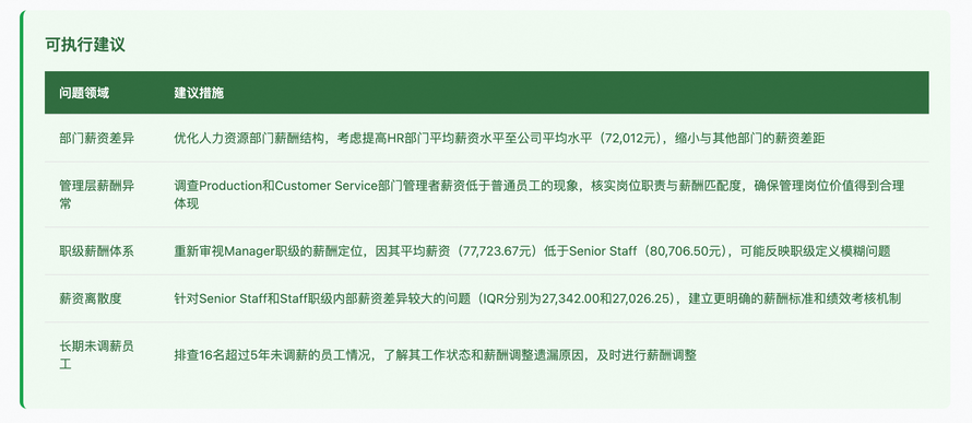 "description": "可执行建议卡片,浅绿色背景(#F0F9F1),绿色左侧竖条(#16A34A)。标题使用深绿色(#2E6B3E)加粗,标题文本为\u201c可执行建议\u201d。以表格形式展示相关建议,表头为\u201c问题领域\u201d和\u201c建议措施\u201d,表头深绿色背景。\n文字颜色使用深绿色(#2E6B3E)。",