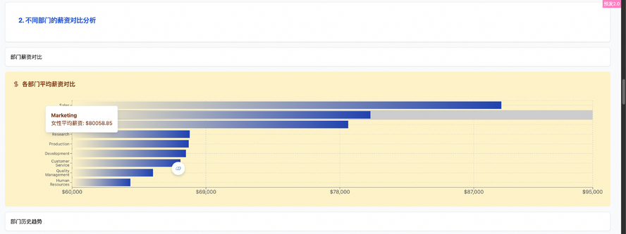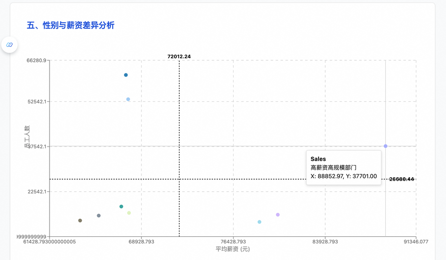 { "type": "Container", "description": "模块五:性别与薪资差异分析", "layout": "Card", "children": [ { "type": "Text", "description": "五、性别与薪资差异分析", "layout": "AdaptiveTitle" }, { "type": "AGUI", "description": "绘制四象限散点图展示部门薪资与人数分布。", "layout": "Chart" } ] } - 效果示例: